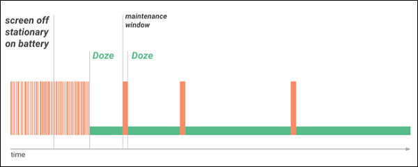 في هذه الحالة ، فقط الإشعارات ذات الأولوية العالية ، مثل المكالمات الهاتفية ورسائل الدردشة ، ستقوم بإيقاظ الهاتف. لن يتم السماح لتطبيقات المزامنة بالبقاء في الخلفية، لأن نظام التشغيل اندرويد يوفر “نوافذ صيانة غير نشطة” في كل مرة ، حيث يمكن للتطبيقات تنفيذ جميع أعمالها في دفعة واحدة كبيرة دون استهلاك طاقة الهاتف.