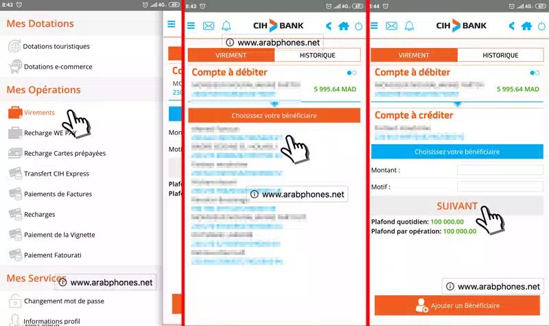 يمكنك من داخل التطبيق تحويل مبلغ مالي من حسابك البنكي إلى أي حساب آخر على بنك CIH أو إلى بنك آخر، مع الأخذ بعين الاعتبار أن التحويل الى حساب بنكي غير حساب CIH سيستغرق من 3 إلى 5 أيام عمل.
