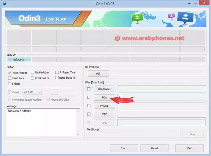 5. بمجرد توصيل الجهاز بالكمبيوتر، سيتعرف برنامج Odin تلقائيًا على الجهاز وستظهر رسالة “Added” على الجهة اليسرى من البرنامج.