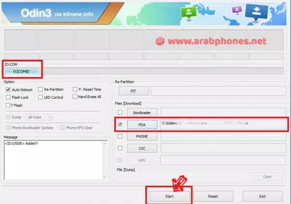 7. الآن ، انقر فوق الزر “Start” في برنامج Odin لبدء عملية الفلاش.