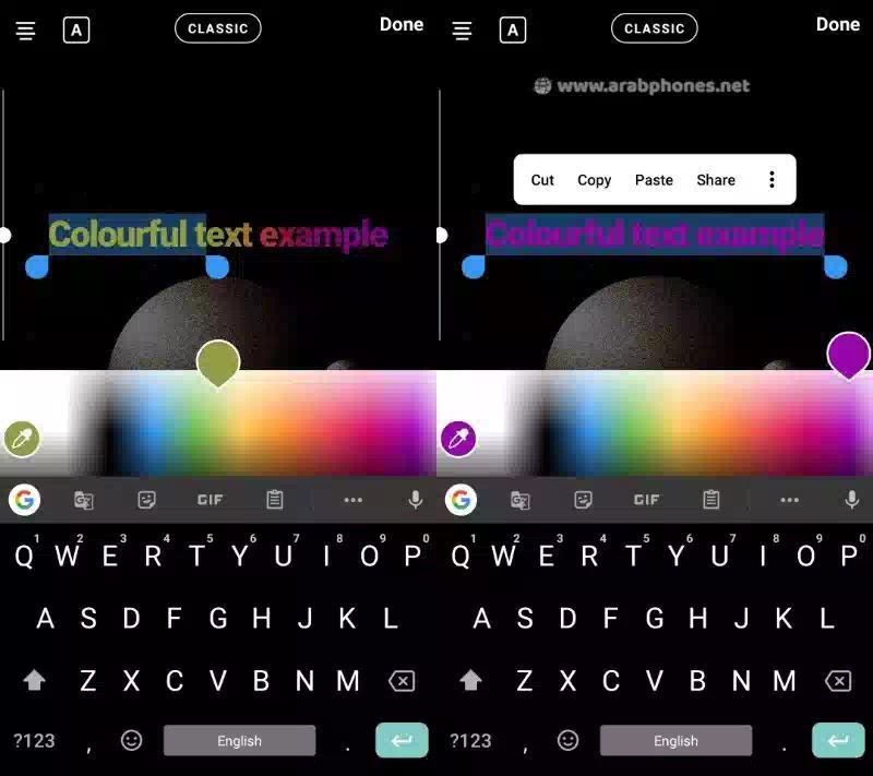 يقدم Instagram مجموعة من الألوان التي يمكن الاختيار من بينها لكتابة نص معين، يكن يمكنك أيضًا استكشاف المزيد من الألوان بعد النقر مع الاستمرار على أي لون معين لفترة طويلة. هنا سأوضح لك كيفية الحصول على تأثير لون قوس قزح للنص الذي تكتبه على قصص Instagram.