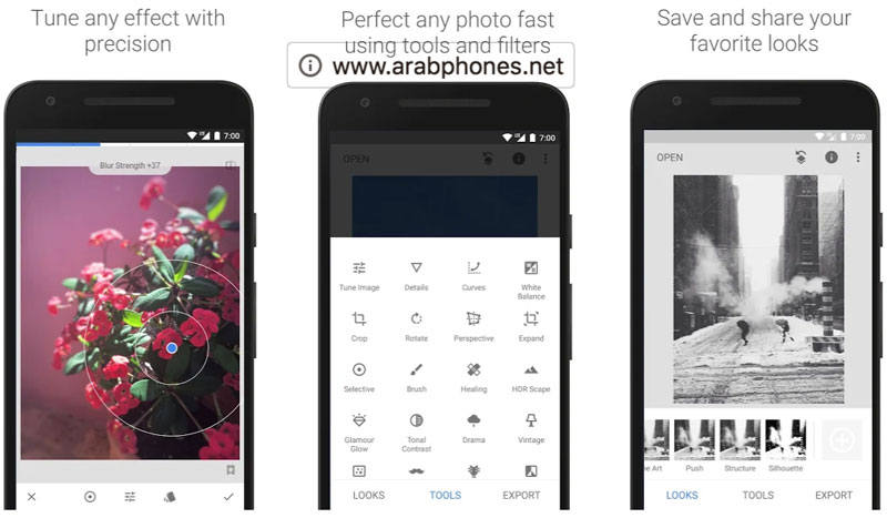 أفضل تطبيق لتعديل الصور على أندرويد، نعم هو يستحق لقب أفضل تطبيق لهذا الغرض، خصوصا وان وراءه الشركة العملاقة Google، ويوفر التطبيق العديد من الأدوات والفلاتر التي يتجاوز عددها 29 بما في ذلك إزالة الشوائب والفرشاة والتركيبة والنطاق عالي الديناميكية والمنظور اضافة الى العشرات من التأثيرات التي يمكن إضافتها إلى الصور والتي جعلت منه أفضل تطبيق لتعديل الصور و بديل للفوتوشوب على الكمبيوتر.