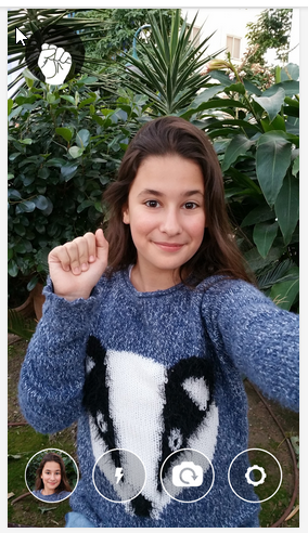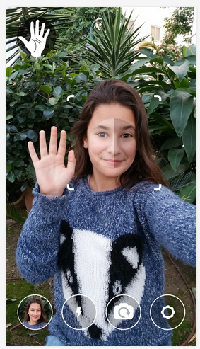 هذه صور توضيحية لما يمكن ان يقوم به التطبيق، بعد توجيه الكامير الى اتجاهك، يكفي ان تقوم باشارت اليد كما في الصورة ليقون التطبيق بالتقاط الصورة مباشرة بدون تدخل منك.