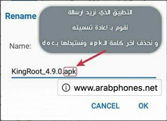 بعد استقبال الملف على المستلم تعديل الاسم بنفس الطريقة ليعيده الى صيغته الاصلية، وذلك عبر حذف كلمة doc واستبدالها بـapk.